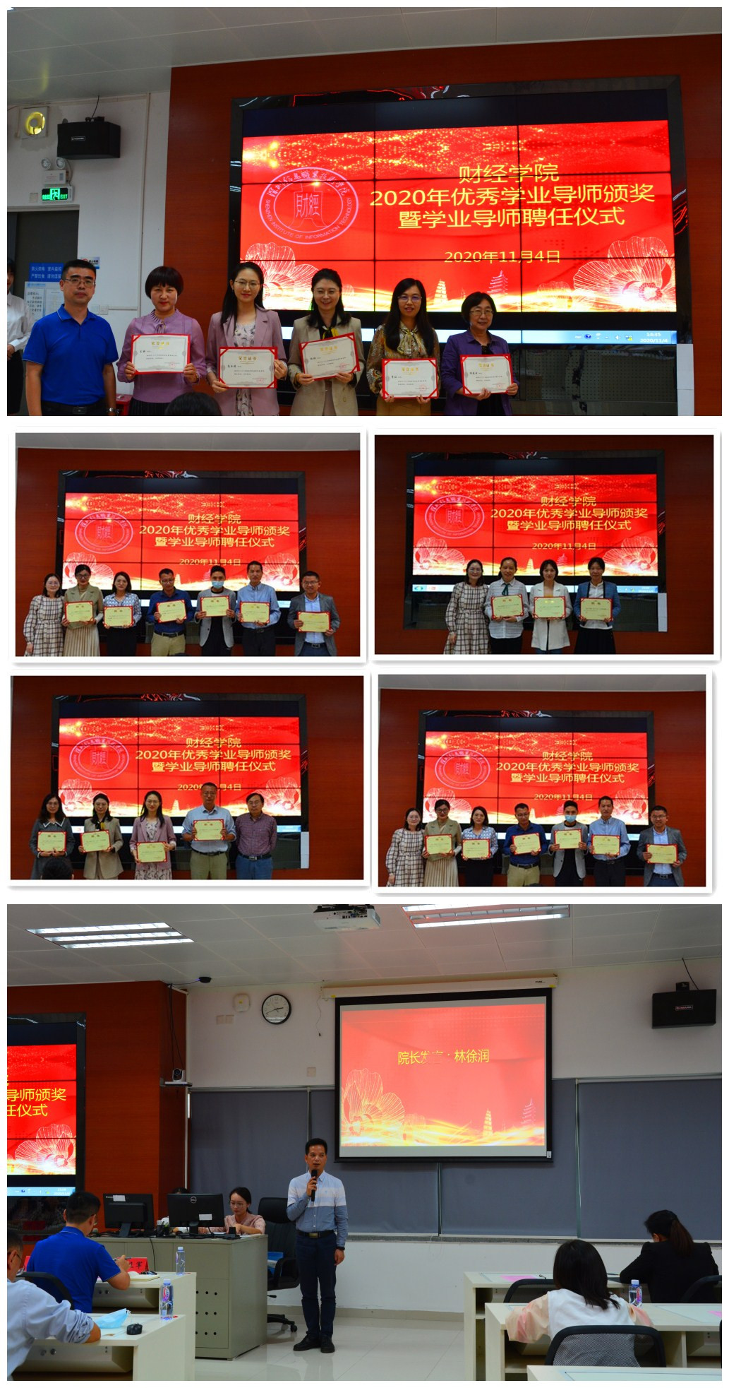 最后,林徐润院长介绍了学院班主任(学业导师)制实施以来的基本情况,对获得优秀学院导师的老师表示祝贺,并对新聘老师提出要求和希望。他提出,财经学院自2018年启动学业导师制以来,在专任教师师资力量不足的情况下,仍为全院49个班级配齐学业导师,更有10名专任教师主动承担起两个班级的学业指导工作。学业导师制经过两年多的试行,也呈现出一批优秀导师;希望新聘老师以优秀导师为榜样,认真履行学业导师的职责,充分发挥个人的专业特长及人格魅力,通过多种形式的交流,起到职业上引导、学业上指导、学风上督导的作用,为提高人才培养质量贡献自己的力量。(财经学院,舒露瑶)